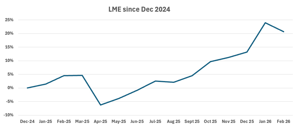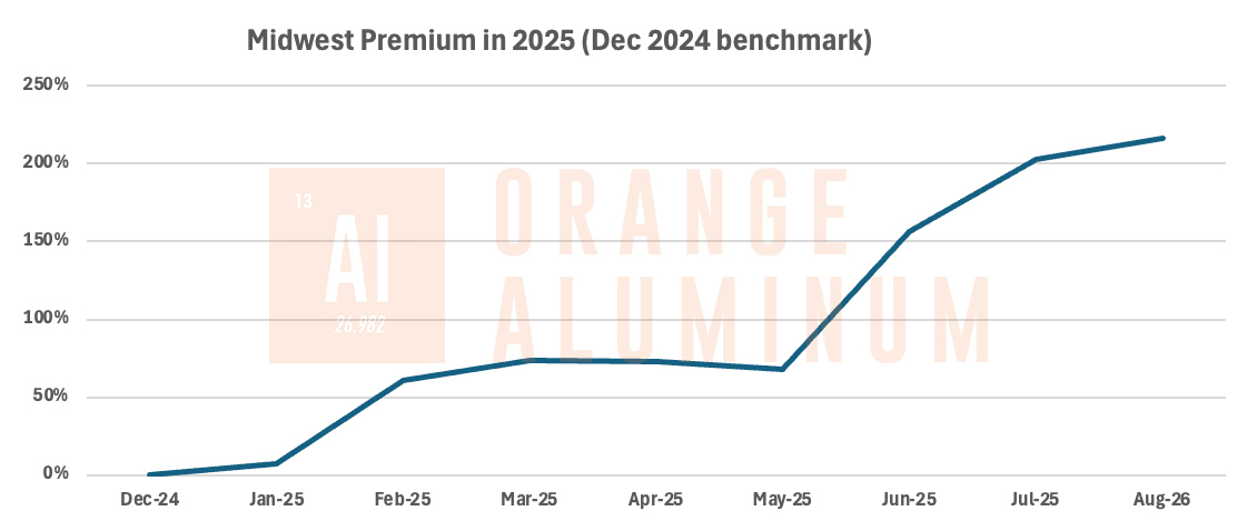 - Midwest Transaction Price – A leading indicator of aluminum pricing in the U.S., this has seen a marked increase as demand shifts to domestic supply.