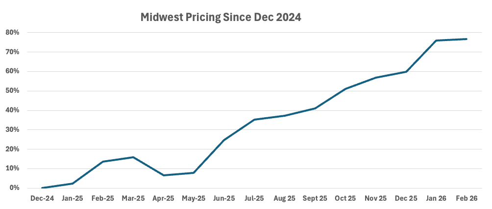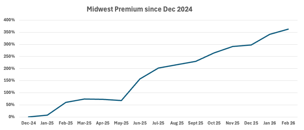 - Midwest Premium – Reflecting costs tied to transportation and regional availability, this premium has also surged.