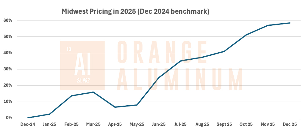 - Midwest Transaction Price – A leading indicator of aluminum pricing in the U.S., this has seen a marked increase as demand shifts to domestic supply.